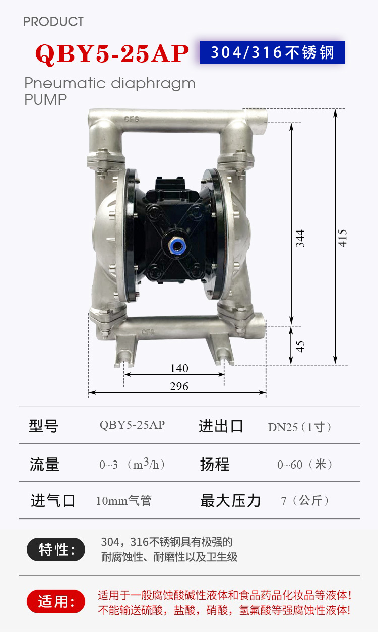 QBY5-25P型不銹鋼氣動(dòng)隔膜泵