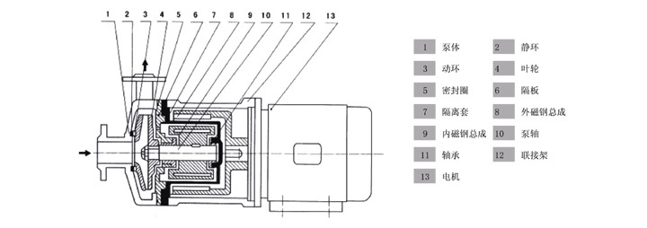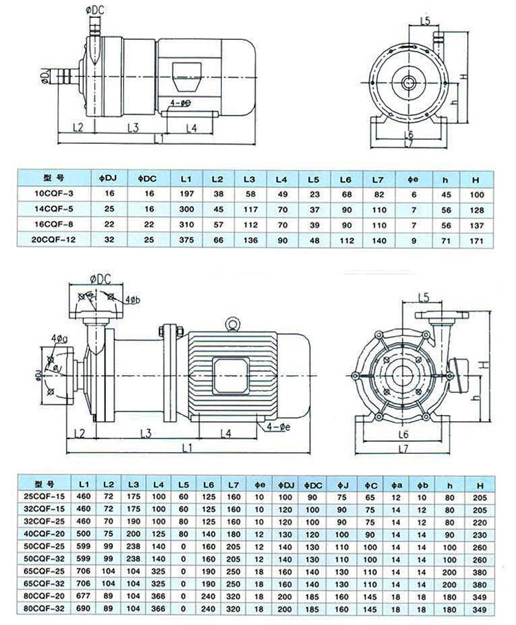 CQF型泵符合Q/YGB01-2002(小型磁力傳動離心泵)標準,產品以增強聚丙烯或聚偏二氟乙烯為主要材料,能耐大多數的有機和無機酸,堿和鹽。也適于在室外大氣中暴露。對應力腐蝕破裂的抗蝕性良好。